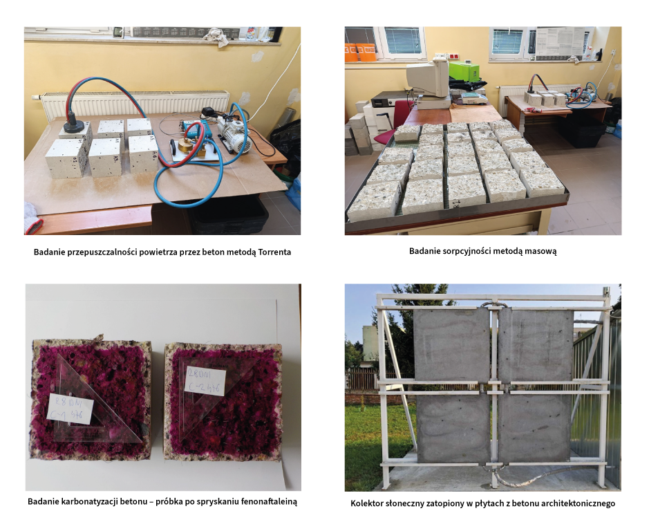 Aktualną tematyką badawczą jest również ocena wybranych właściwości betonu z odpadowym tworzywem sztucznym po zużytych butelkach PET. Betonowe elementy są poddawane badaniu wytrzymałości na rozciąganie różnymi metodami i na uderzenie. Badany jest także skurcz betonu. Kolejnym tematem badawczym jest opracowanie technologii wykonania kolektora słonecznego do podgrzewania wody użytkowej, zatopionego w płytach z betonu architektonicznego oraz określenie jego efektywności.